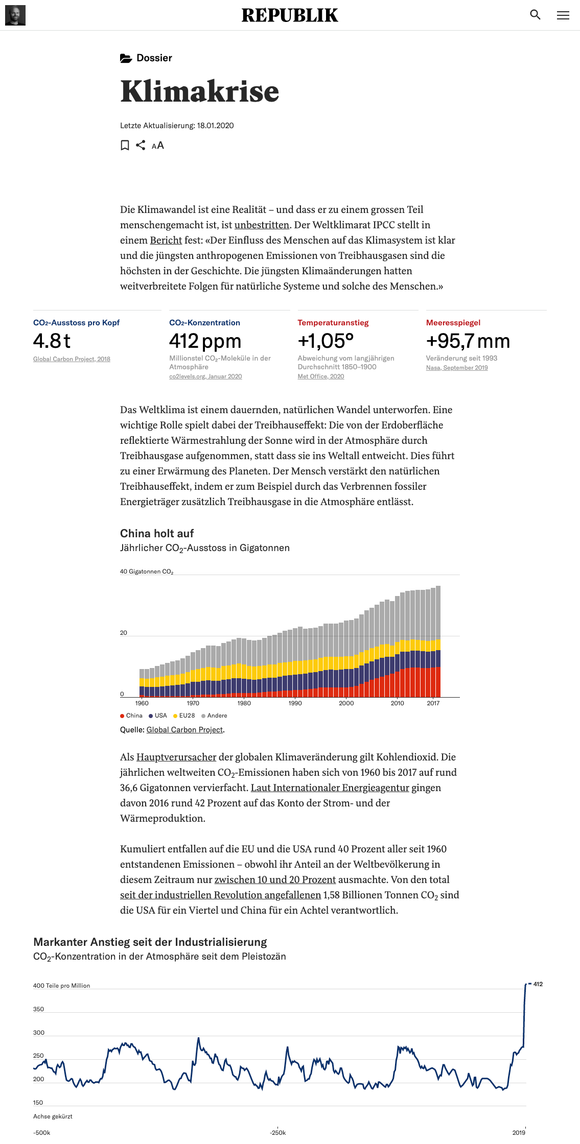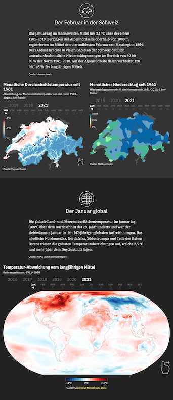 With the aim of providing readers with concise overviews of the important issues of the day—while also resurfacing the most relevant pieces of existing content—I introduced the “dossier” format at Republik. A dossier consists of a single, continually-updated page containing key metrics, crucial facts and links to selected Republik articles about an issue. The purpose of the dossier format is to give important topics a permanent home within the publication and to offer summaries that are both informative and visually appealing. The list of dossiers is growing steadily. During my time at Republik I was the author and maintainer of two of them: